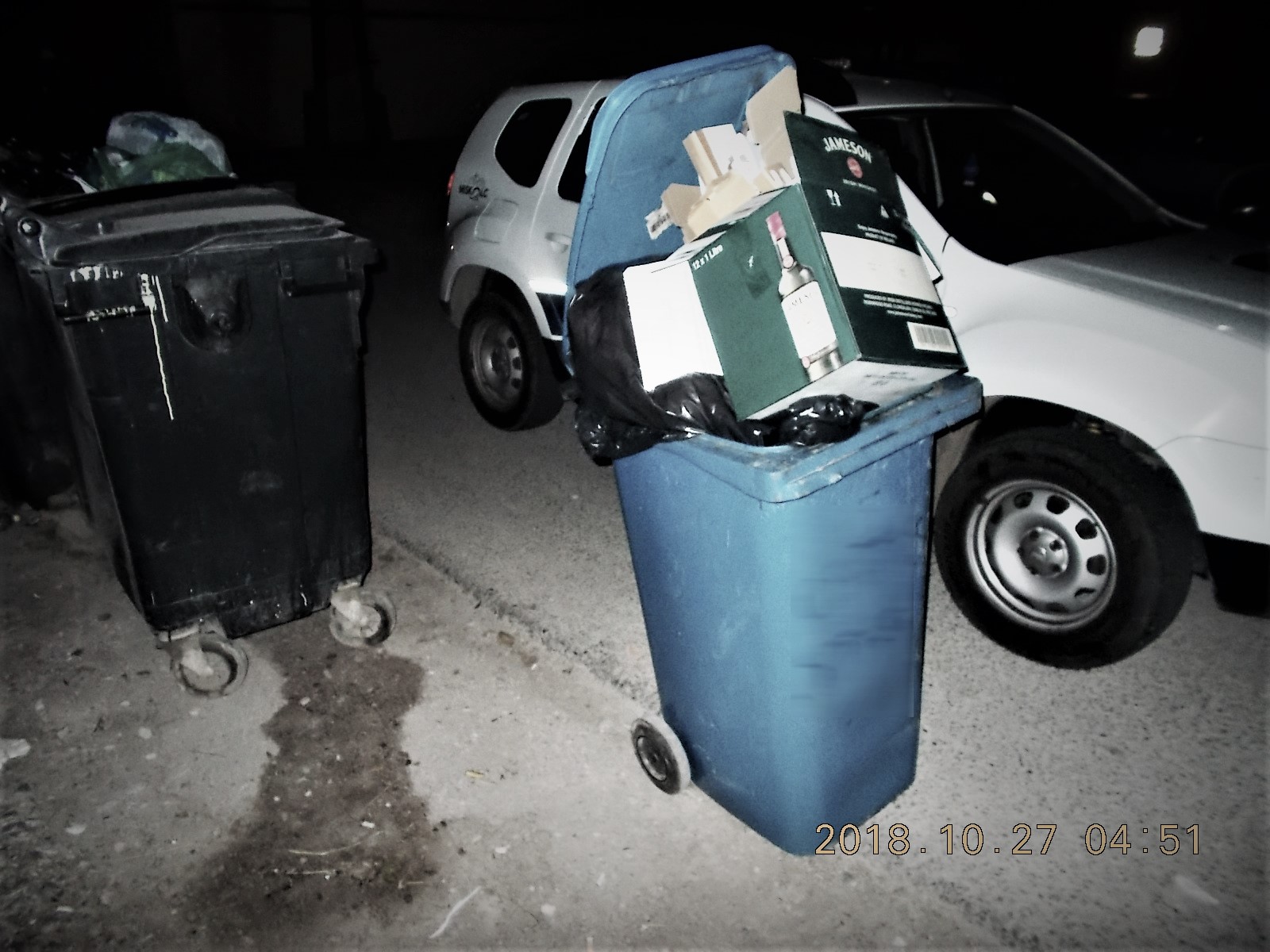 Október 27-én, hajnali 4 óra 30 perckor a MiÖR térfelügyeleti kamerás szolgálata észlelte, hogy egy férfi a Kandia köz irányából – a Széchenyi István utcán át – a Nagy Imre utcába, egy nagyméretű (240 literes) – feltehetően vendéglátó szolgáltatási tevékenységet folytató üzlethelyiségből származó – telt hulladékgyűjtő edényt húz maga után. A térfelügyeleti szolgálat a MiÖR gépjárműves szolgálatát haladéktalanul a helyszínre küldte. A járőrszolgálat rendészei a férfit feltartóztatták afelől érdeklődve, hogy mit szándékozik a szeméttel csinálni.